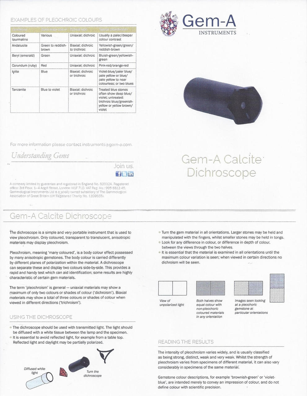 This Wide-View model of Dichroscope, of the respected Gem-A brand out of the United Kingdom, is set apart from other dichroscopes with its larger observation squares, making it easier for students to observe the colours seen in pleochroic gemstones, and to identify weak dichroism/trichroism even in very small gemstones.