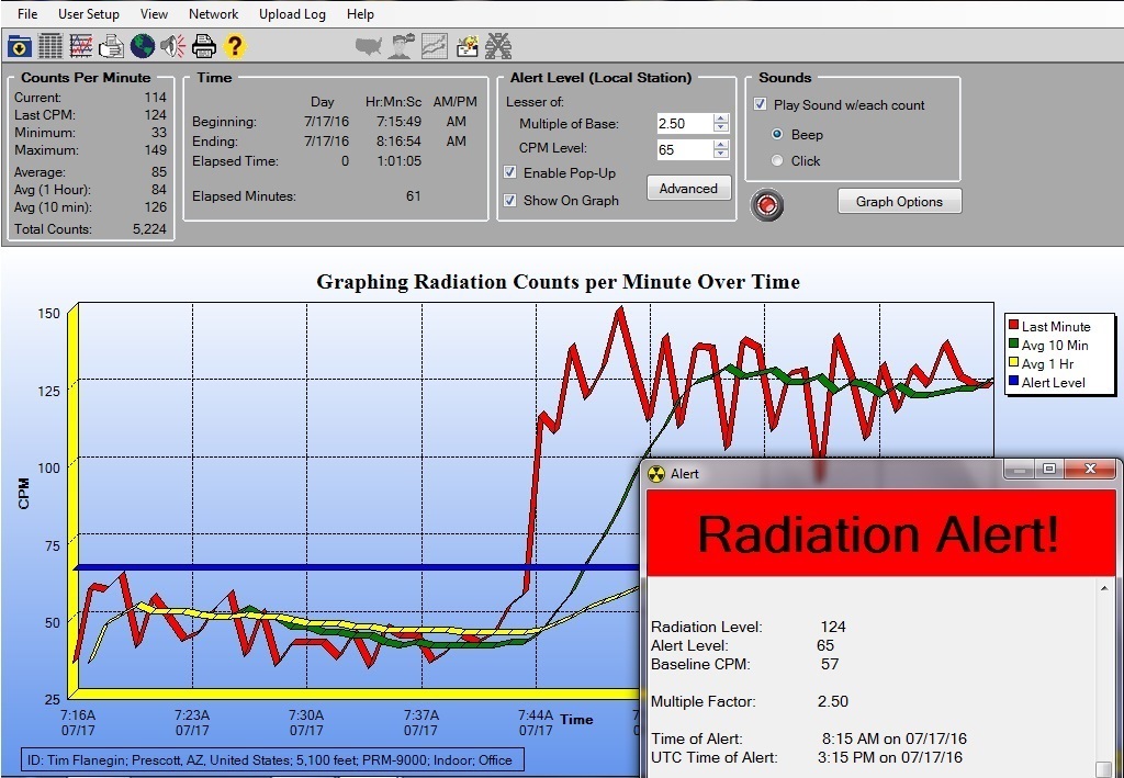 The GeigerGraph software is especially useful for monitoring environmental radiation, alerting you to any elevated levels relative to your typical background count. The software issues an audible and visual alert (play this Alert sound file) whenever the CPM exceed a user set desired level. For example, the picture above shows the program first monitoring background radiation, but then halfway through the monitoring period, issuing a visual alert because some radioactive "event" caused the radiation counts to exceed the user set Alert Level.
