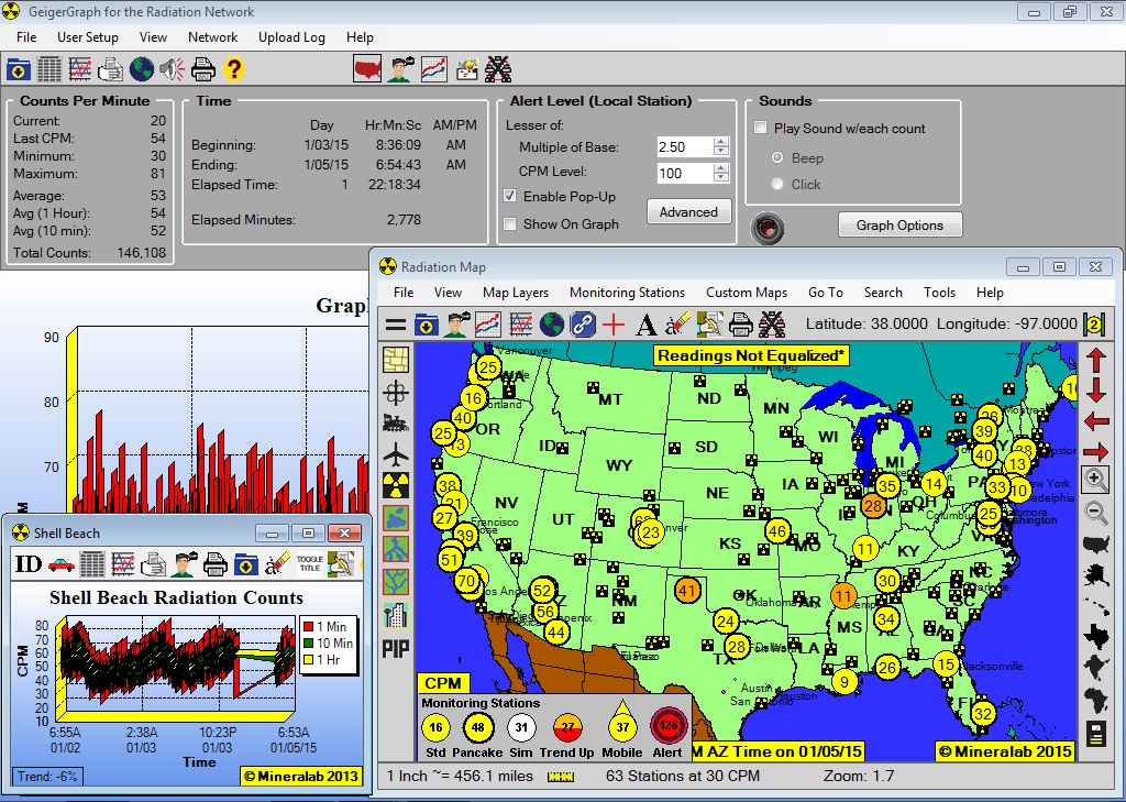 Meanwhile, the graph window at the lower left of the Main Screen represents the graph of a representative Remote Monitoring Station, providing minute by minute Radiation detail, as well as access to a log of the data by spreadsheet, along with detailed identification information for that station. A Remote Graph like this is readily available for every station shown on the Map.